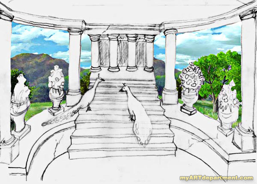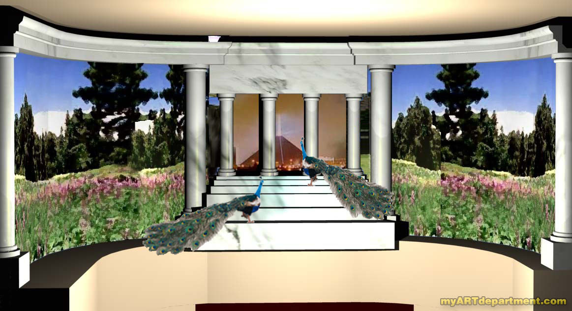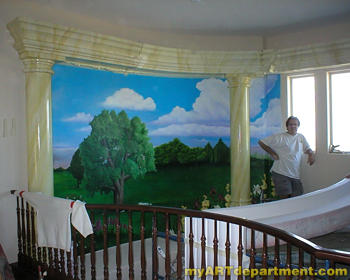 This mural was painted for client in Las Vegas. They had a grand 2 story entry to their home and wanted and large installation of a mural and marble columns. We came up with a design for the mural and then designed a facade of faux marble to be made from construction foam.