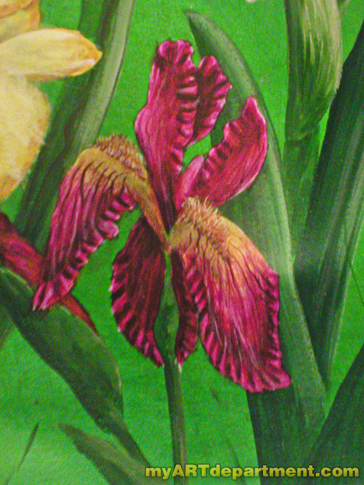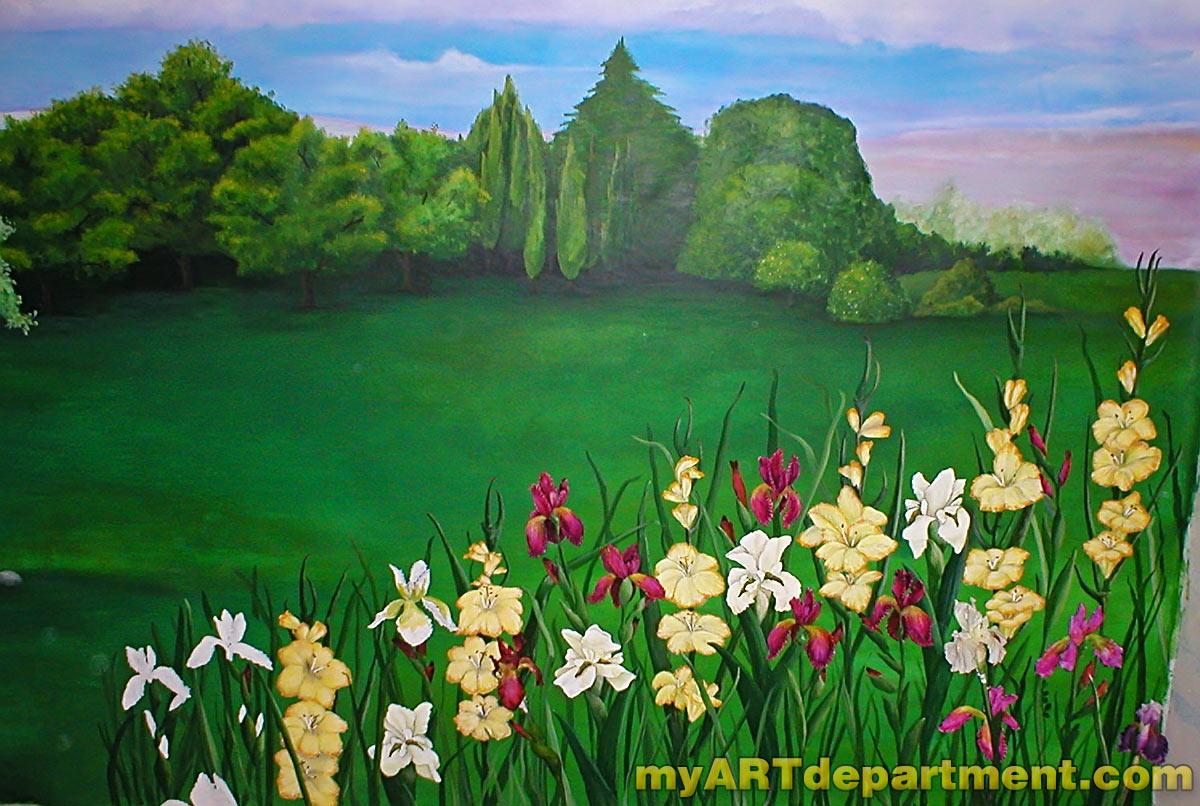 The mural is of a pastoral scene with flowers and trees and border by the faux marble. We worked with a local company to measure the space and construct the foam pieces. Cindy painted the marble on the foam and then we installed it and the mural. I wish I had my new camera around when I took these photos.