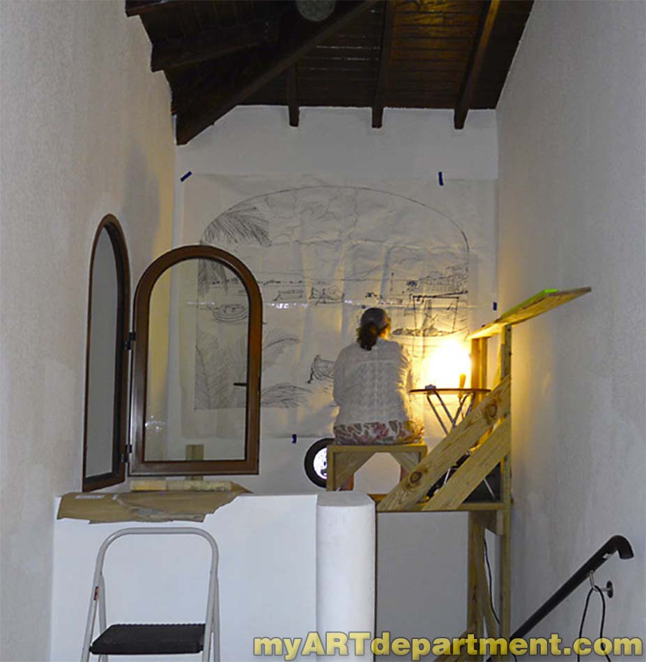 This timeless design was painted in a residence in St. Maarten. St. Maarten is a small Caribbean Island paradise. Cindy had a great time painting this beautiful mural and was done ahead of schedule – so that meant more time for diving and shopping! The mural was high up on a wall to match the other windows, so I painted while on scaffolding.