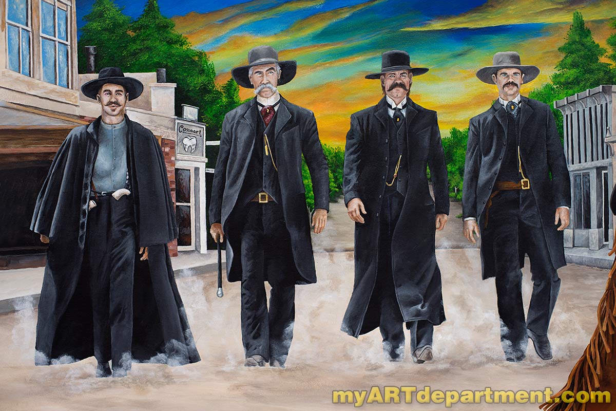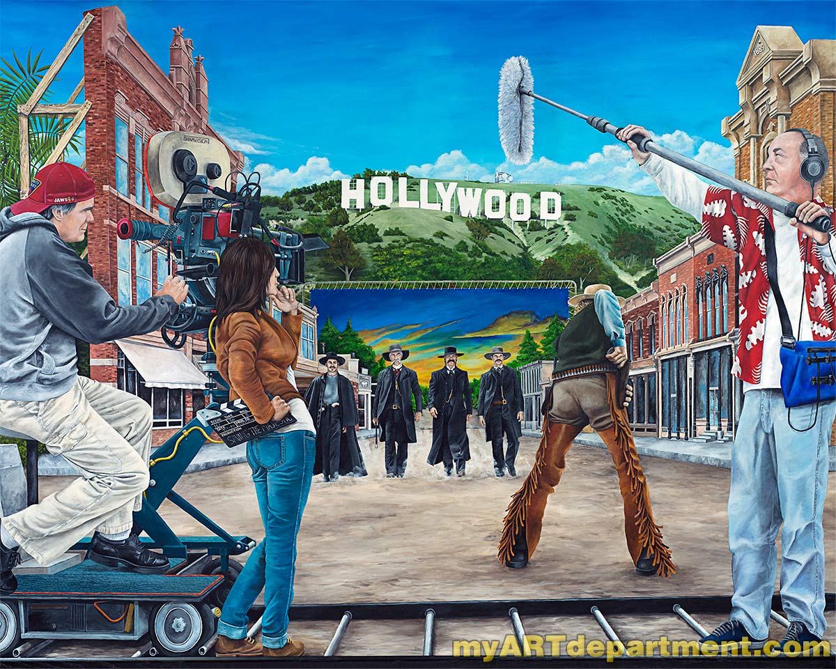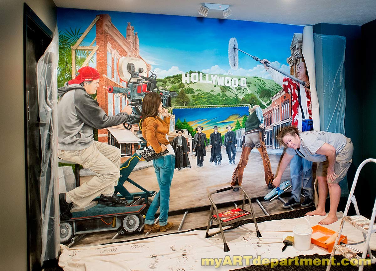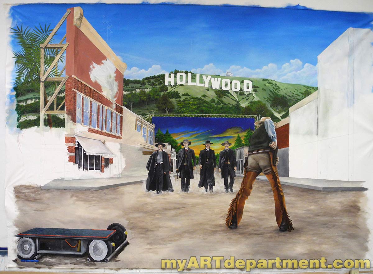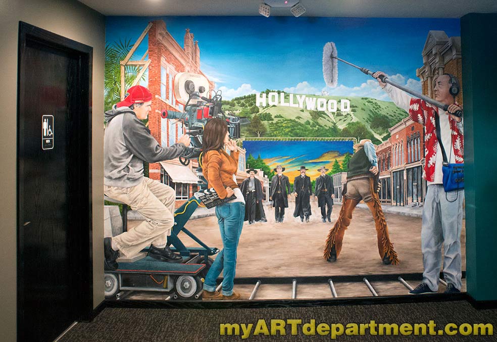 I was commissioned to create a mural for a local volunteer operated movie theatre in a small town. I was had to come up with a design that appealed to all ages. So I went with a Hollywood backlot scene that included some old west gunfighters, the Hollywood hills, a painted backdrop and a film crew. I submitted my sketch and it was approved.